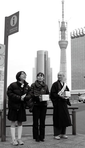 東京の浅草駅周辺で三月二十四日、東日本大震災義捐金托鉢募金が行われた。同青年会の会員のほか、寺族、OB会員に加え、落語家・古今亭菊千代さん、ちよりんさんも参加し、二十四人が街頭に立った。