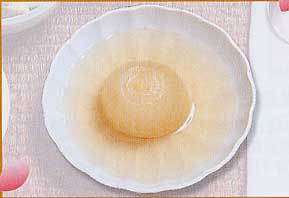 (1)たっぷりの昆布でとっただし汁に塩・こしょうをして玉ねぎを入れ弱火で煮る。