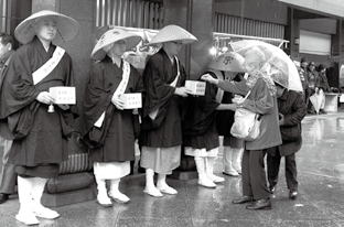 四のつく日はご縁日とあって、雨にもかかわらず多くのお参りの人が訪れる。托鉢に立ったのは東京曹洞宗青年会の十五人。あじろ笠に衣をたくし上げた道中着、白い脚絆、足袋が目に眩しい。冷たい雨の中、本堂前に一同が集まり、お経を唱えたあと、募金箱を手に境内各所に分かれた。