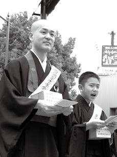 東京の浅草駅周辺で三月二十四日、東日本大震災義捐金托鉢募金が行われた。同青年会の会員のほか、寺族、OB会員に加え、落語家・古今亭菊千代さん、ちよりんさんも参加し、二十四人が街頭に立った。