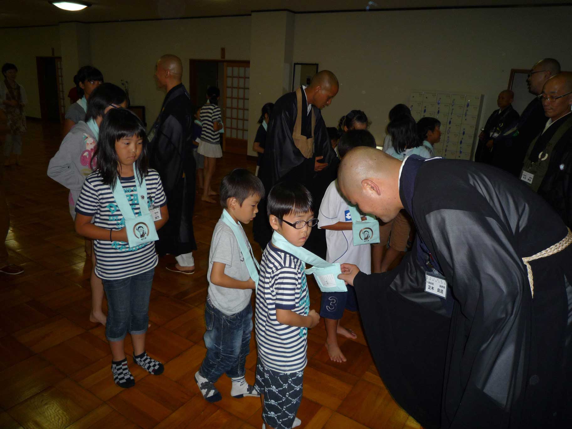 永平寺内を歩くときは常に叉手。子どもたちは輪袈裟の代わりに仏様の智慧袋を下げる