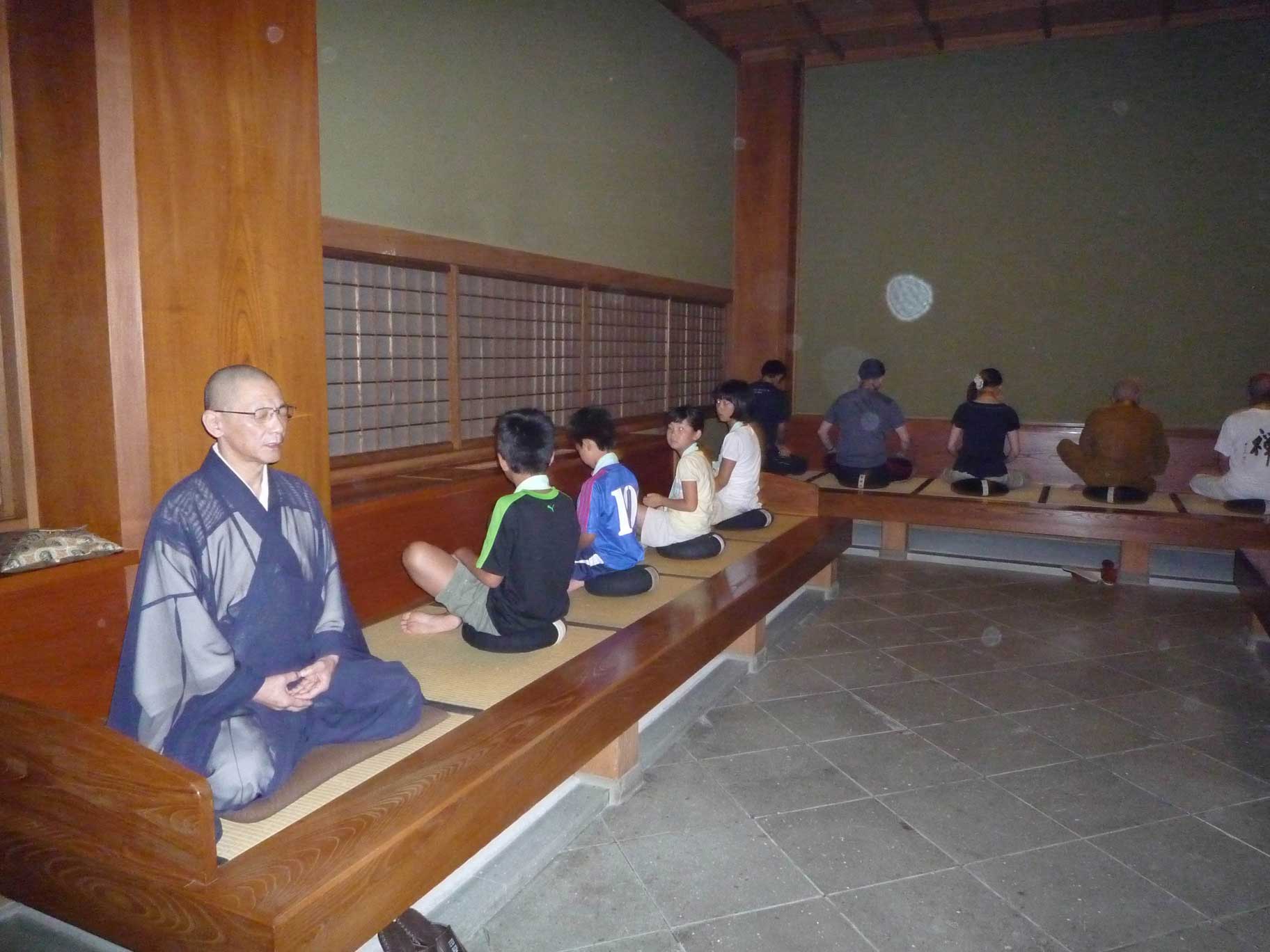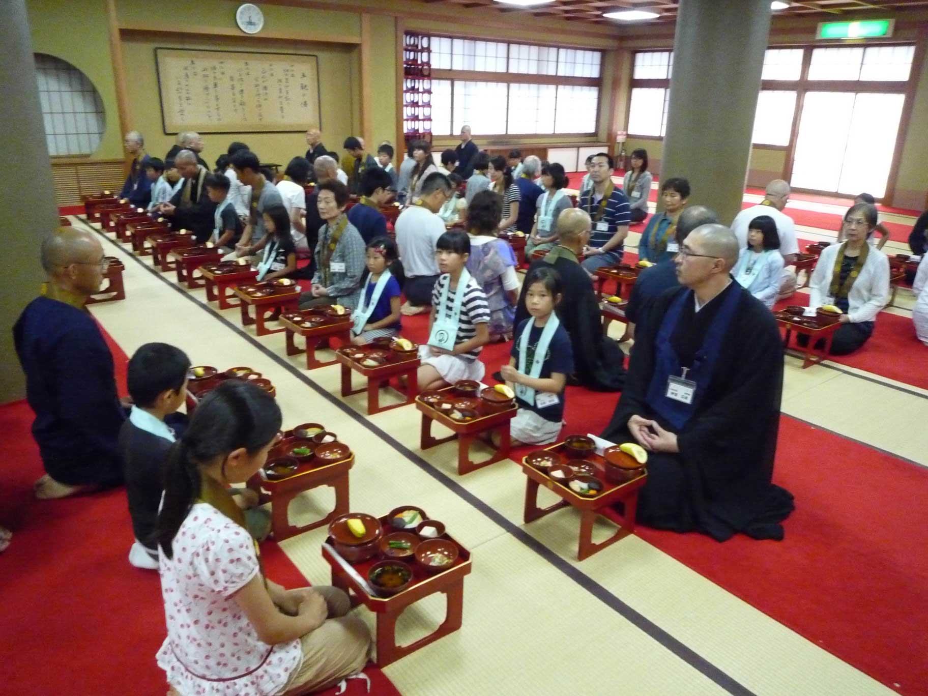初日は今後の日程説明と、肩慣らしのような坐禅があって、これはいわばイントロ。本番は、早朝三時起床、夜九時就寝という二日目。時間的には短縮してあっても、様式・作法は雲水の修行そのままという本格的な坐禅に始まり、荘厳な永平寺の朝のお勤め、まだ薄明の中で大勢の修行僧たちによってなされる読経の響きは、一気に参加者親子を十三世紀当時から続く、揺らがない不動の歴史的時間の中に引きずりこむ。