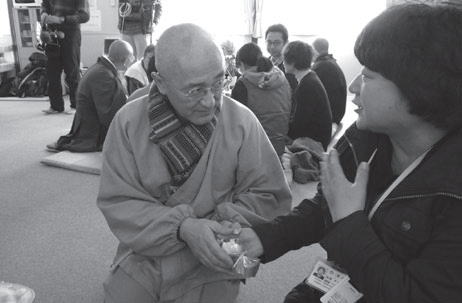 インタビューをしている間にも、二人の年輩の女性が訪ねてきた。年忌法要の相談のようだった。プレハブの仮本堂の中で、ご住職はお茶を出して、親身になって話を聞いている。法要の相談だけではない。今の身の回りのこと、被災のこと。瓦礫のように積もった思い、癒えない心の痛みを告げたいという願い。それらが、被災者たちの心に澱のように溜まっていることは、ここでも明らかだった。