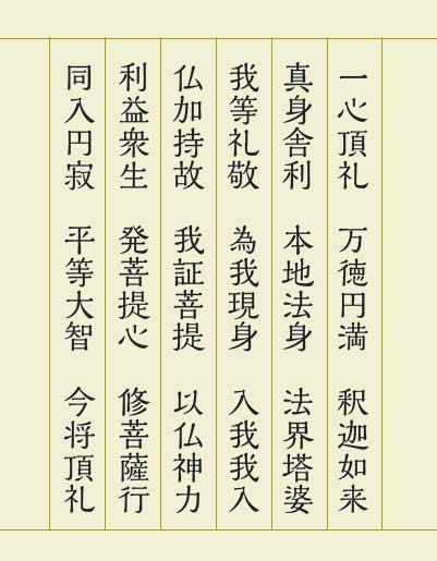 一心に、万徳円満なる釈迦如来の真身舎利と、本地の法身と、法界の塔婆に頂礼したてまつる。我等が礼敬したてまつれば、我が為に身を現し、入我我入す。仏の加持が故に、我は菩提を証し、仏の神力を以て、衆生を利益す。菩提心を発し、菩薩行を修し、同じく円寂に入る。平等なる大智に、今将に頂礼したてまつる。