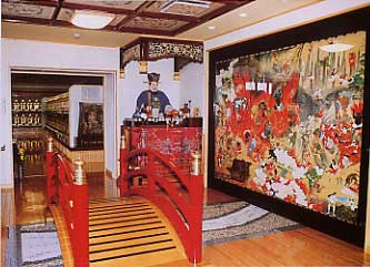 しかし何と言っても圧巻なのは、位牌堂入口にある板の門に作られた地獄の風景だ。右壁面に掛けられた、大きな地獄絵図を見ながら三途の川に架かる朱塗りの太鼓橋を渡ると、そこには閻魔大王がにらみをきかせて待ちかまえている。首切り・火炙り・八ツ裂きの刑などが描かれている地獄絵を見て、子供たちはどう感じるのだろうか。